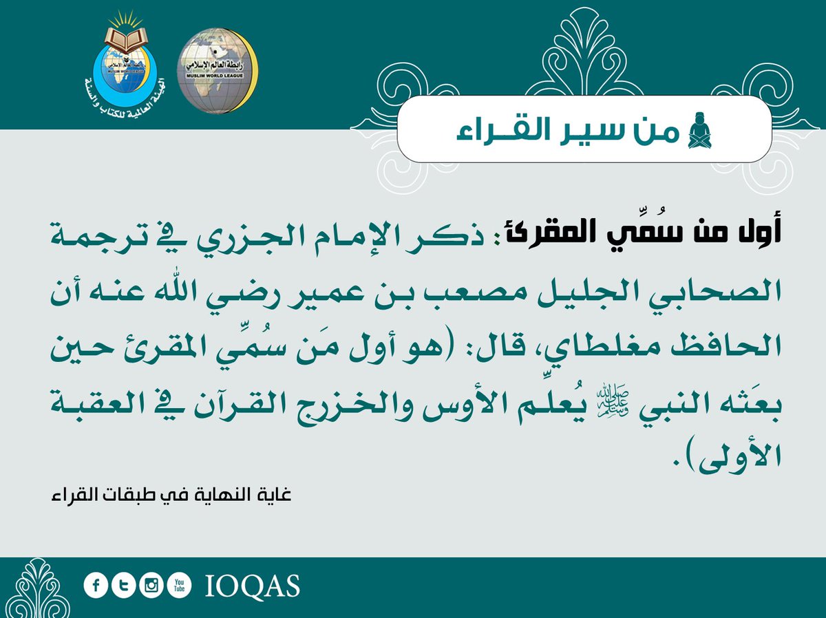 الهيئة العالمية للكتاب والسنةさんのツイート أول من س م ي المقرئ ذكر الإمام الجزري في ترجمة الصحابي الجليل مصعب بن عمير رضي الله عنه أن الحافظ مغلطاي قال هو أول م ن س م ي المقرئ حين بع ثه