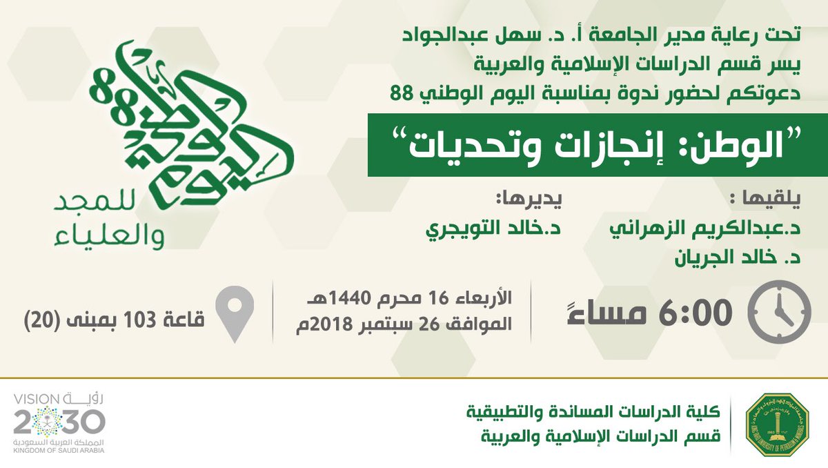 جامعة الملك فهد للبترول والمعادن Kfupm On Twitter تحت رعاية مدير الجامعة يسر قسم الدراسات الإسلامية والعربية دعوتكم لحضور ندوة بمناسبة اليوم الوطني88 الوطن إنجازات وتحديات غدا الأربعاء ١٦ محرم